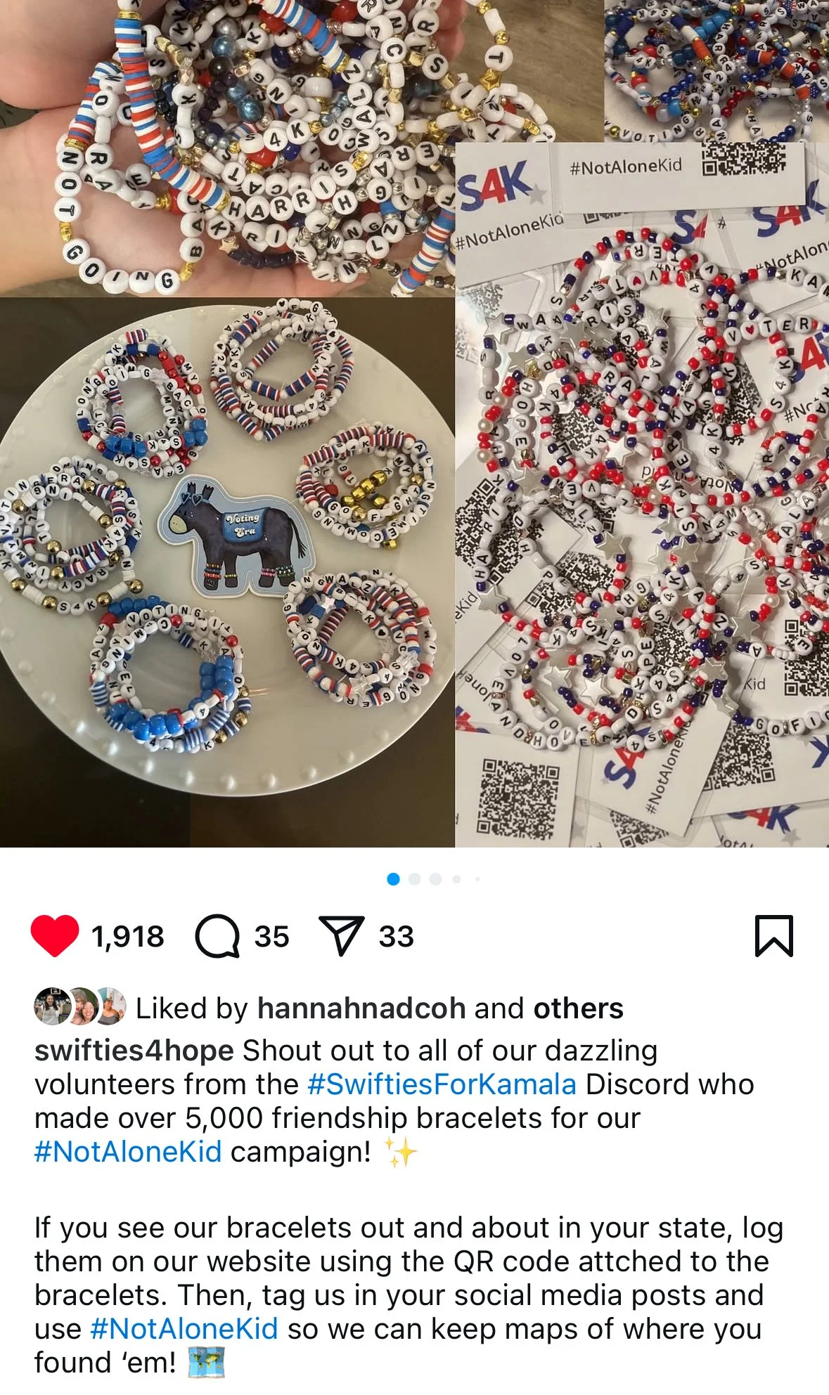 The Not Alone Kid campaign asked volunteers from the Swifties For Kamala Discord to make friendship bracelets with an attached QR code linked to a page with voting information by state. The bracelets were then distributed in 49 states + DC. I managed social media support for the campaign, including organizing an IG live to announce the bracelets' distribution and creating posts to share them in the wild.